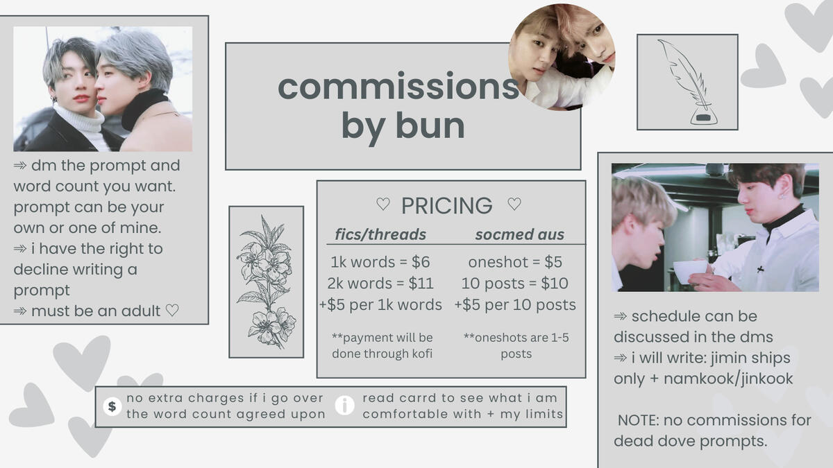 -➾ just confess with confessions (or lack thereof), light angst, fluff, cuddles, unrequited love that's actually requited love, some written parts, fourty tweets social media au.➾ do you love me? with love potions, confessions, fluff, whipped koo, some written parts, forty six tweets social media au.➾ happy new year with ceo jimin, hired date jungkook, fluff, new years eve parties and a new years kiss, forty tweets social media au.➾ mishaps 🔞 with a/b/o, omega jungkook, omega jimin, neighbors jikook, crack, vers jikook, twenty tweets social media au.➾ how to train your sub: the series, part 1 🔞 with camboy subtop jungkook, rich viewer dombottom jimin, half social media au, half written au, jungkook auctions off his virginity to jimin